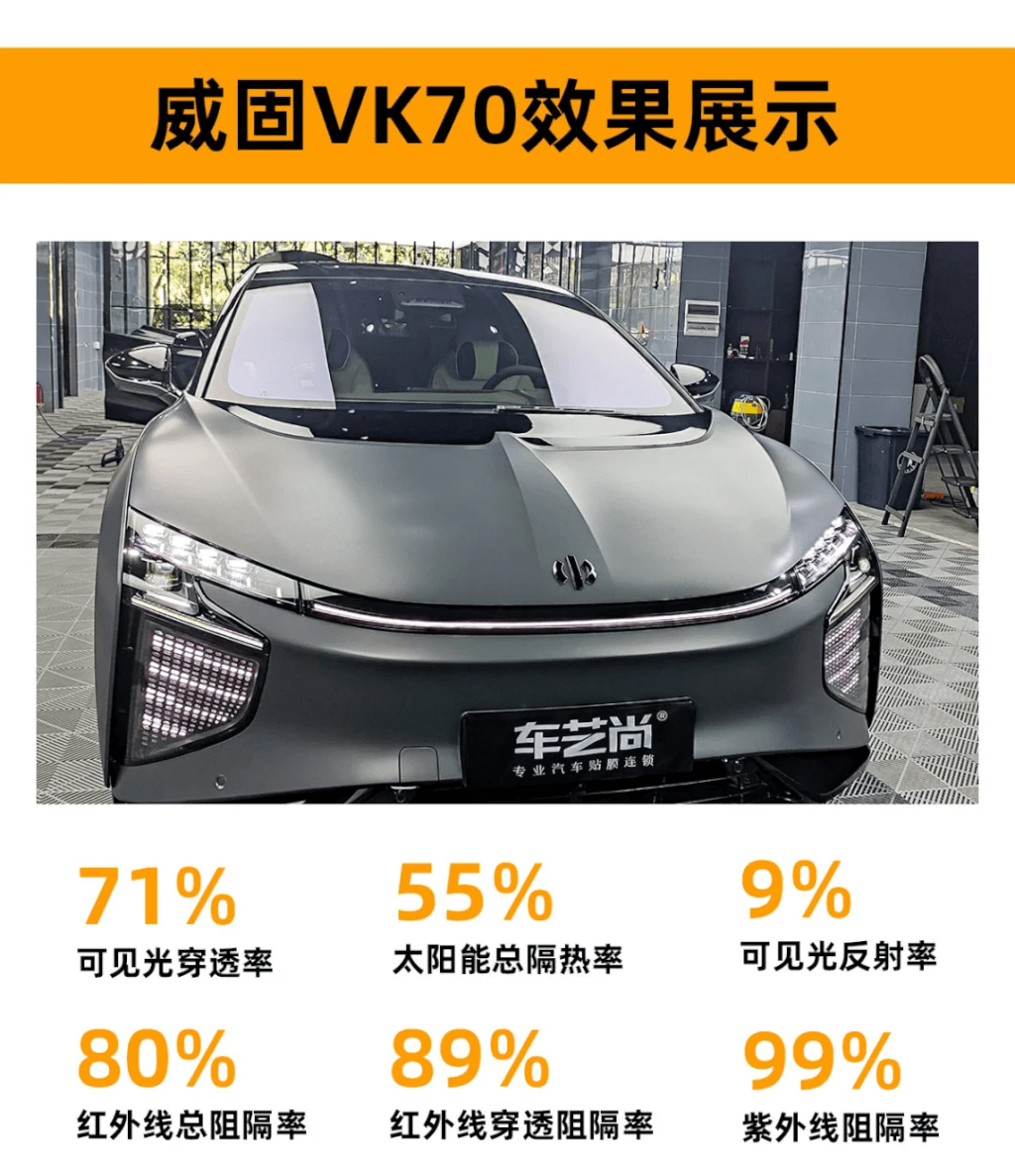 威固VK70以其卓越的性能和合理的价格,成为了许多车主的首选。无论是单独更换前挡膜,还是作为全车隔热方案的一部分,VK70都能提供出色的隔热效果和清晰视野,是值得选择的高品质隔热膜。