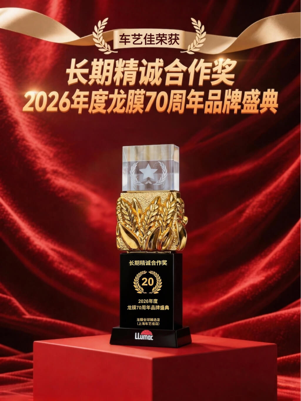 长期精诚合作奖:龙膜70周年品牌盛典上对长期合作核心伙伴颁发了"长期精诚合作奖",车艺尚作为龙膜二十多年的核心伙伴获得此项荣誉