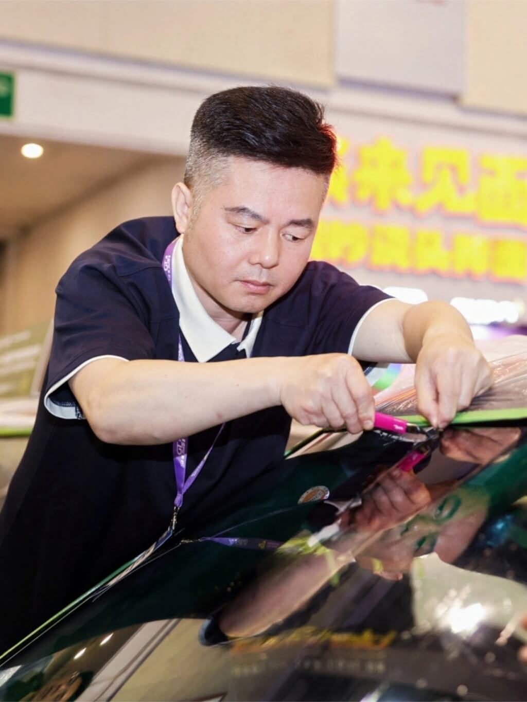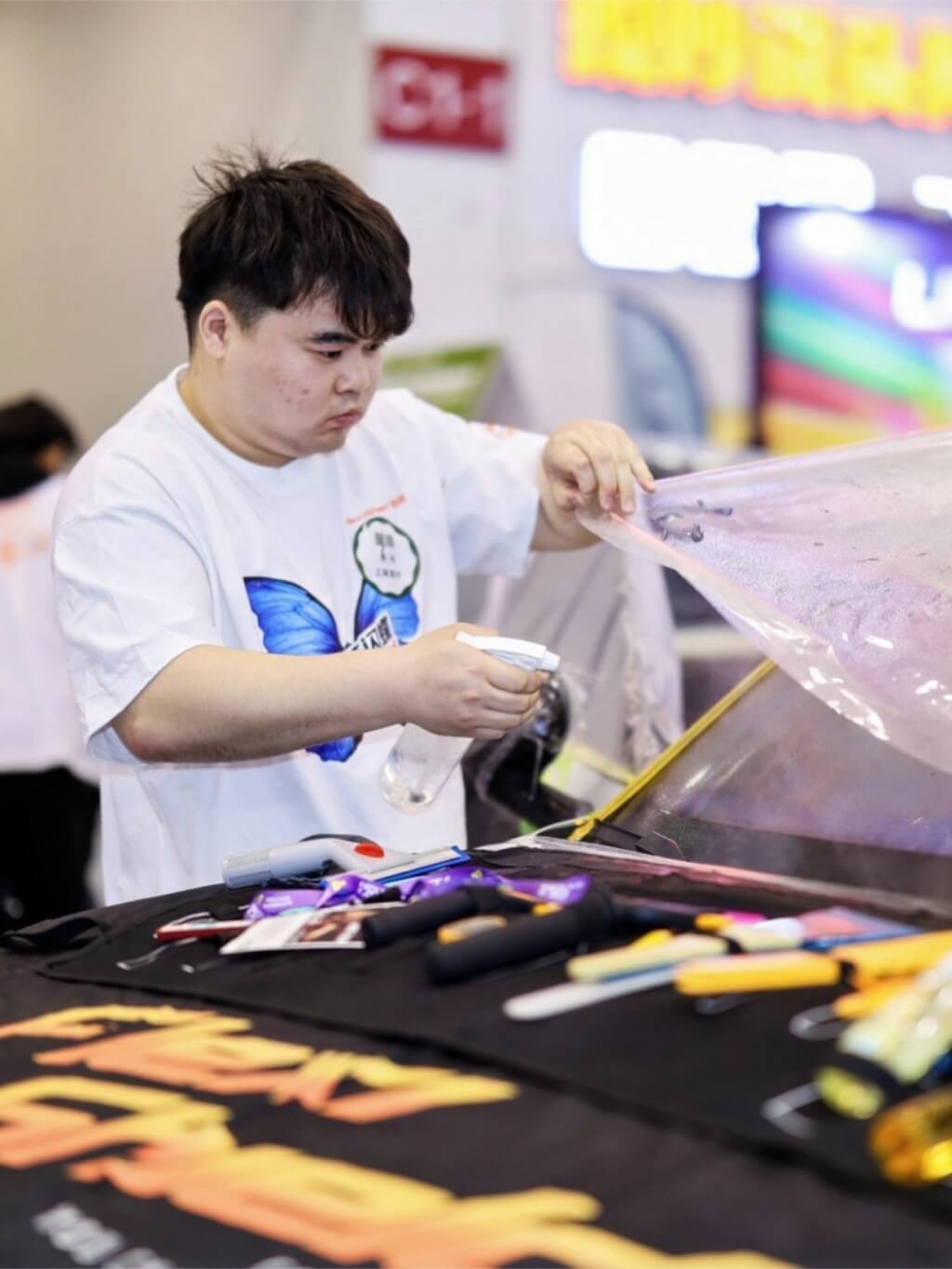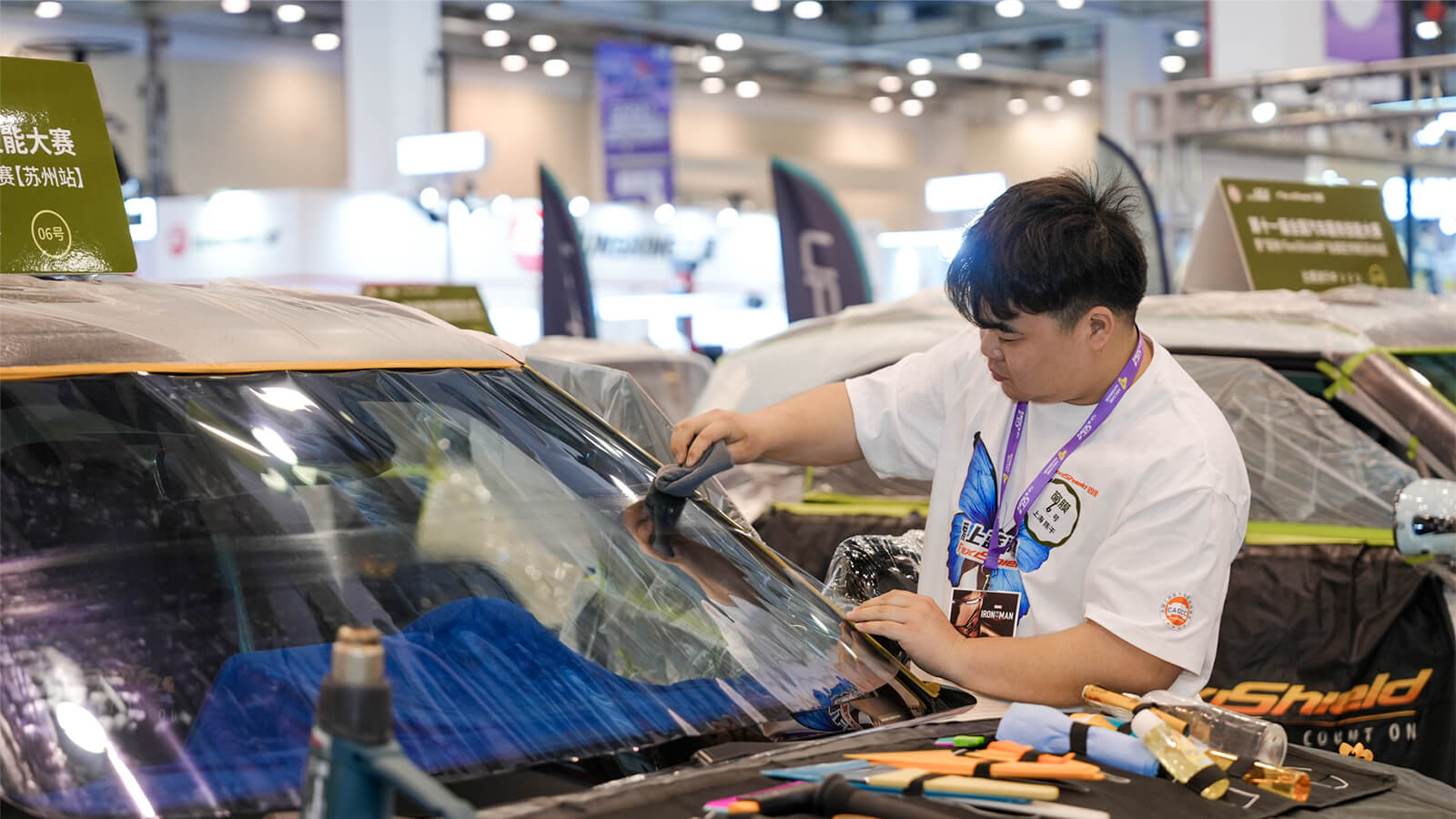 比赛项目涵盖了隔热膜、漆面保护膜装贴等多维度装贴工艺,不仅考验技师的操作速度,更对施工的精度、细节处理提出了严苛要求。