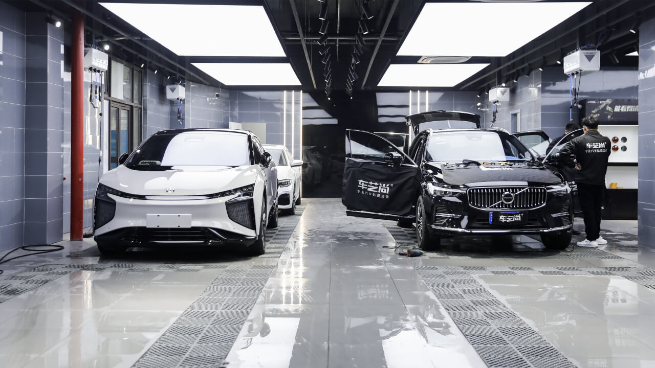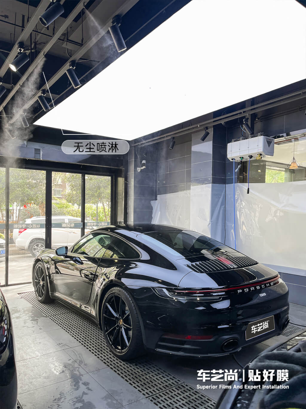 南京旗舰店采用洁净的封闭玻璃装置,并配备专业的雾化喷淋装置。该装置可模拟微雨环境,最大限度降低空气中的悬浮尘埃,为贴膜施工提供接近无尘的洁净环境。灰尘是贴膜最大的敌人,车艺尚用专业设备将起泡、翘边的风险降到最低。