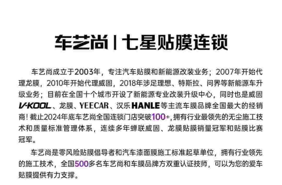 车艺尚是全国工商联汽车经销商商会(CADCC)三大汽车贴膜施工技术规程的核心起草单位。贴膜系统化、规范化。