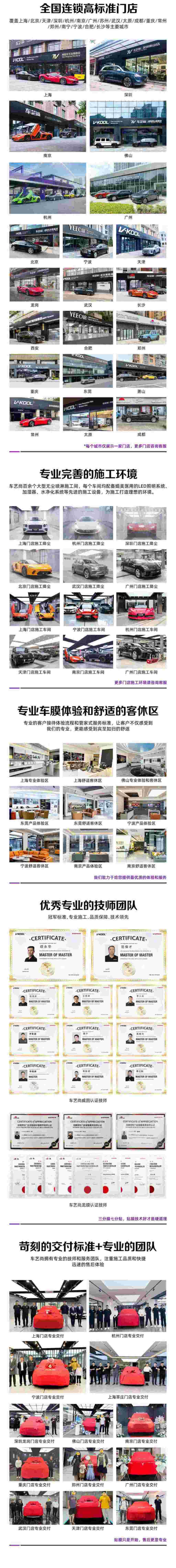 • 车身改色膜:进口铸造级PVC/TPU改色膜,色彩饱满、不伤原漆、揭除无残留;