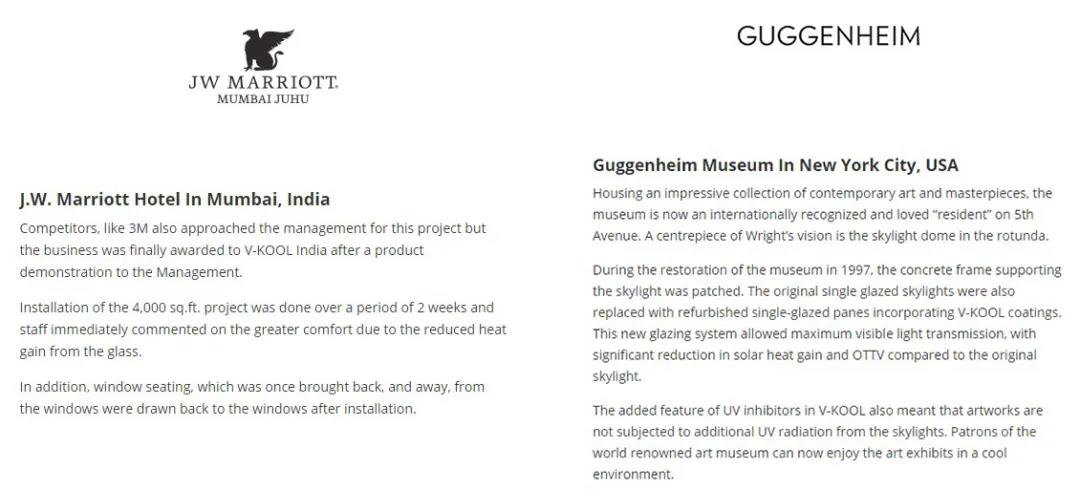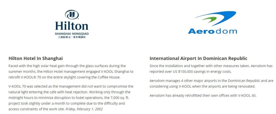 威固膜出色的隔热技术受到了全世界的认可,美国斯坦福大学、华盛顿特区的美国建筑师协会大楼、美国纽约古根海姆博物馆、上海希尔顿酒店等,均采用了威固玻璃膜。欧洲名车宝马760、奔驰S600、奥迪A8 W12等,更是出厂就配置威固隔热膜技术。