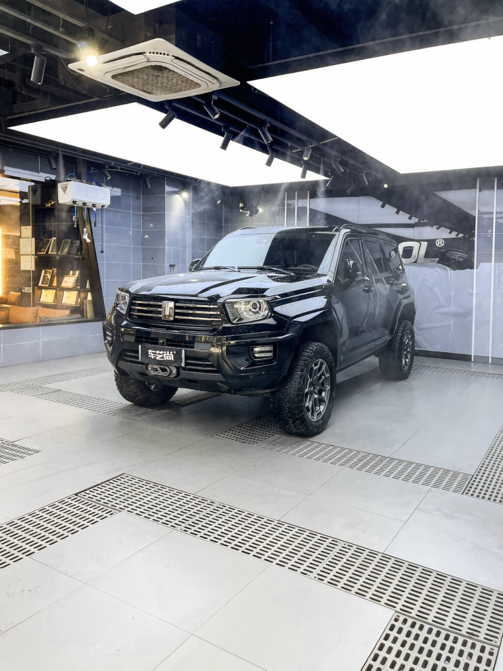 店内施工间在保证喷淋装置安全间距的前提下,采用上百个射灯+无影顶灯的搭配设计,可以为贴膜提供360°无影光源,无论在清洁车身、贴膜施工,还是在最终的验收复检环节,都可以达到最大限度的无死角照明。