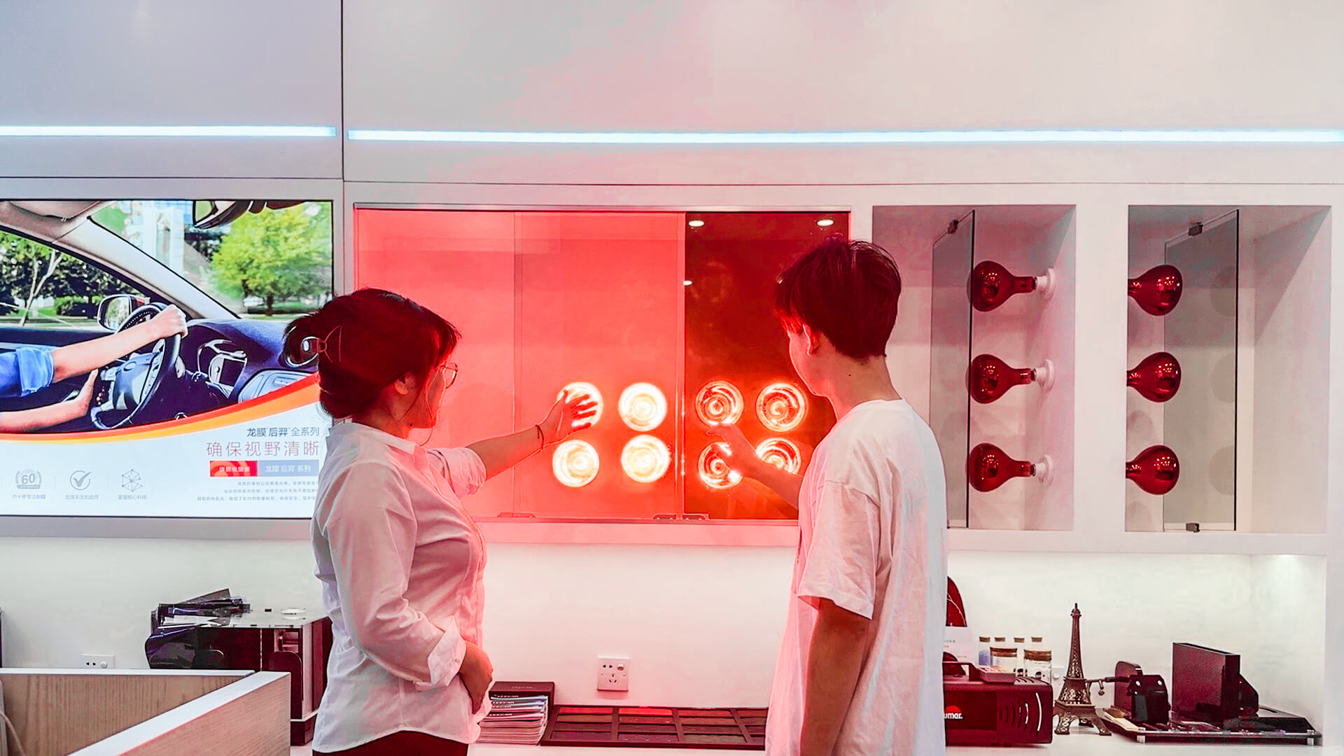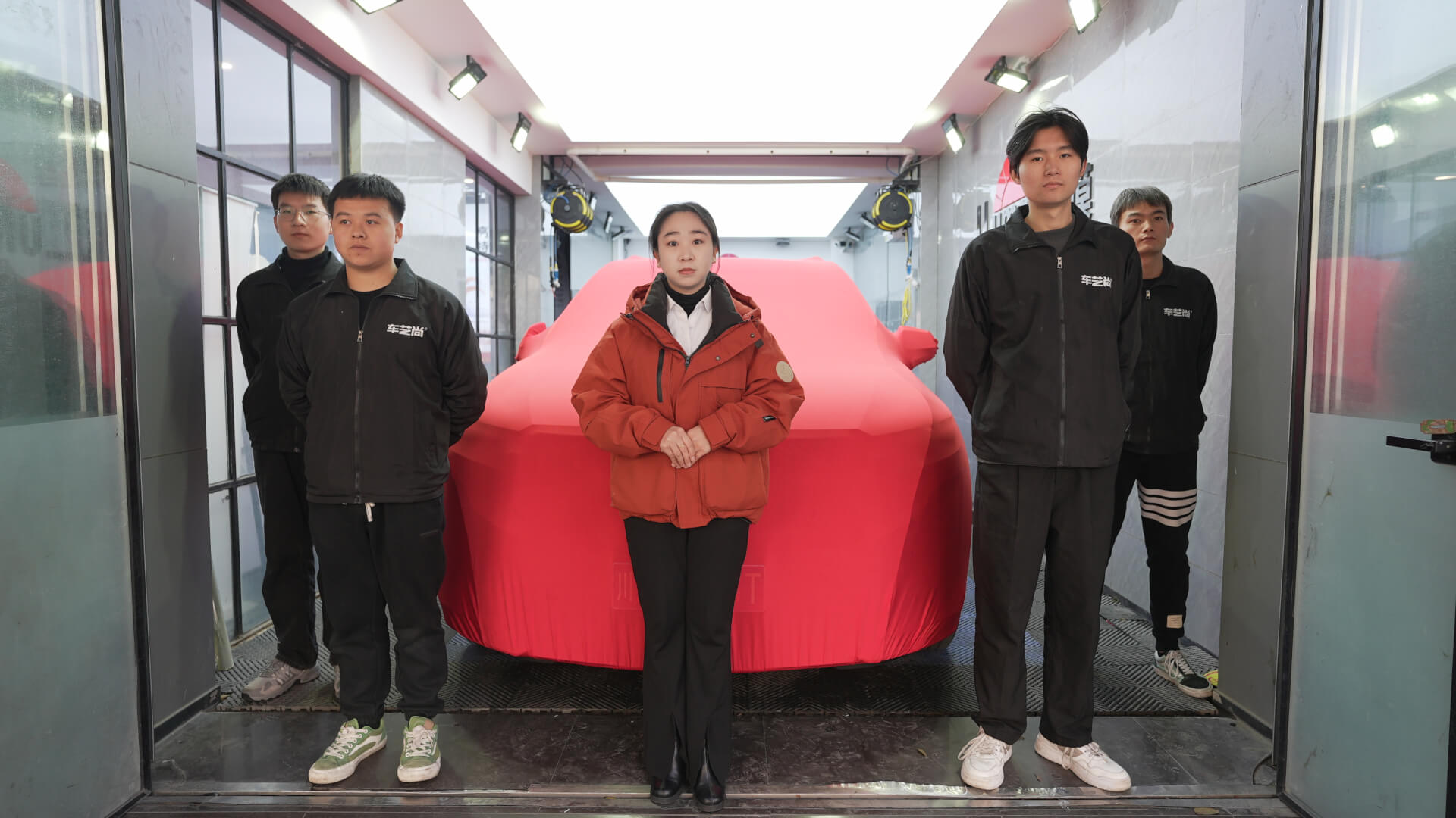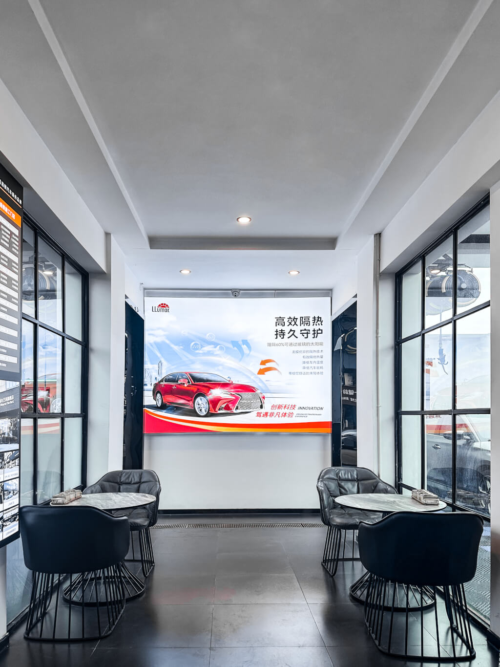 车间顶部装有专业照明设备,方便技师施工,并均匀排列喷淋设备,可通过降水减少车间粉尘,使施工环境湿度更适合贴膜。